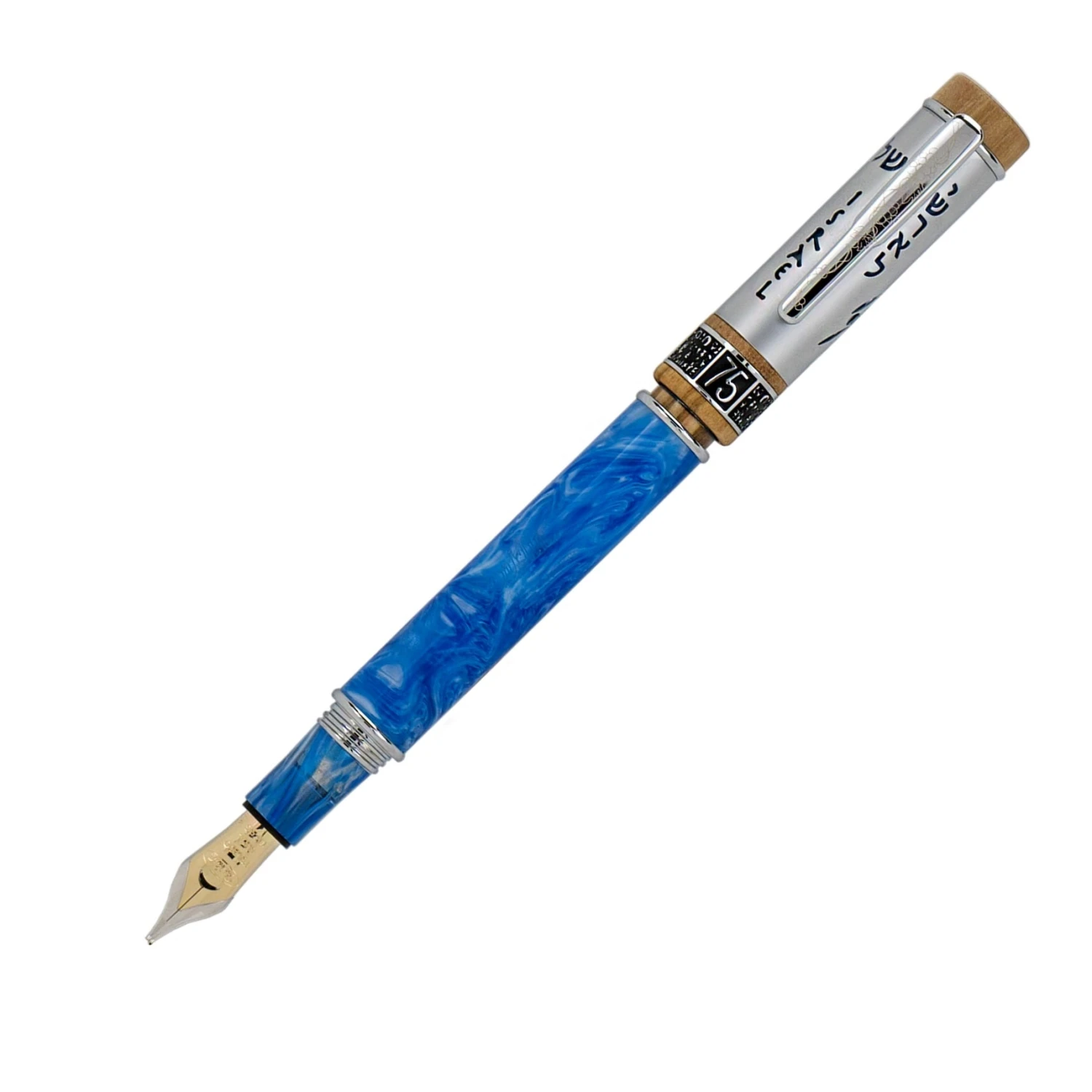 Machined to perfection and scrupulously hand-polished, the Israel 75 body features one of a kind high-graded blue and white resin, olive wood, and is then adorned with striking chrome accents along the overlay, clip and rings.
