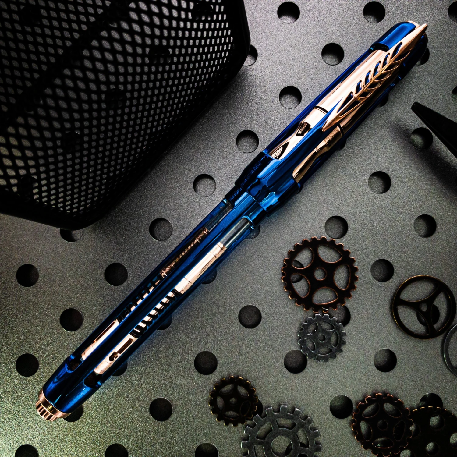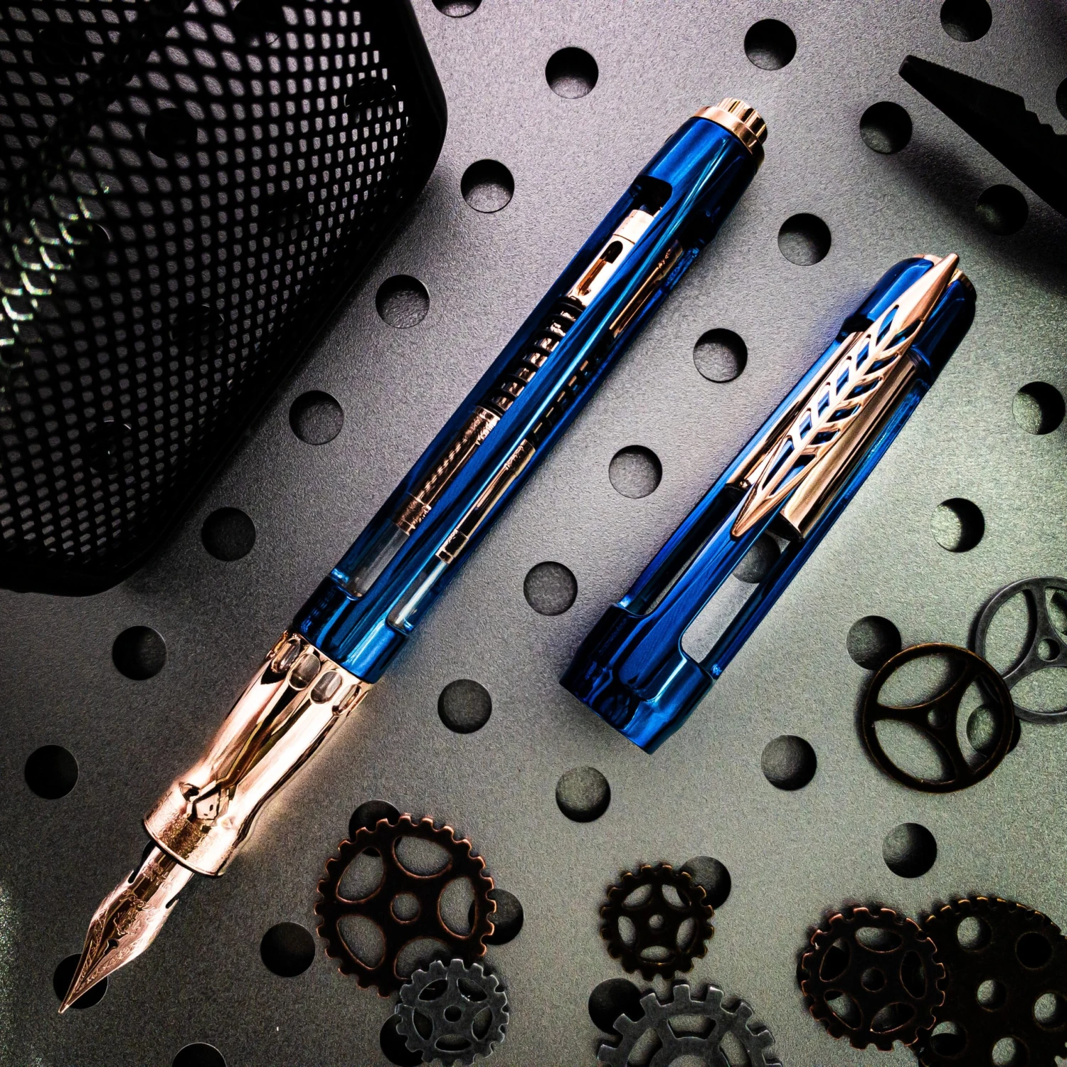 The twist magnetic lock, Pineider’s ingenious capping method, employs magnets to snap the cap into a secure, closed position, keeping the nib primed for the next writing endeavor. The rose gold trim provides a contrast to the blue body; the nib, grip, and filling mechanism are all finished in rose gold.
